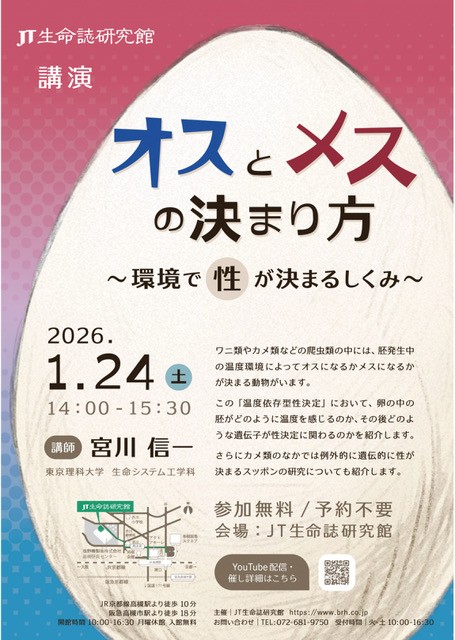 JT生命誌研究館 講演会「メスとオスの決まり方~環境で性が決まる仕組み~」(宮川信一)開催(現地/オンライン)のお知らせ