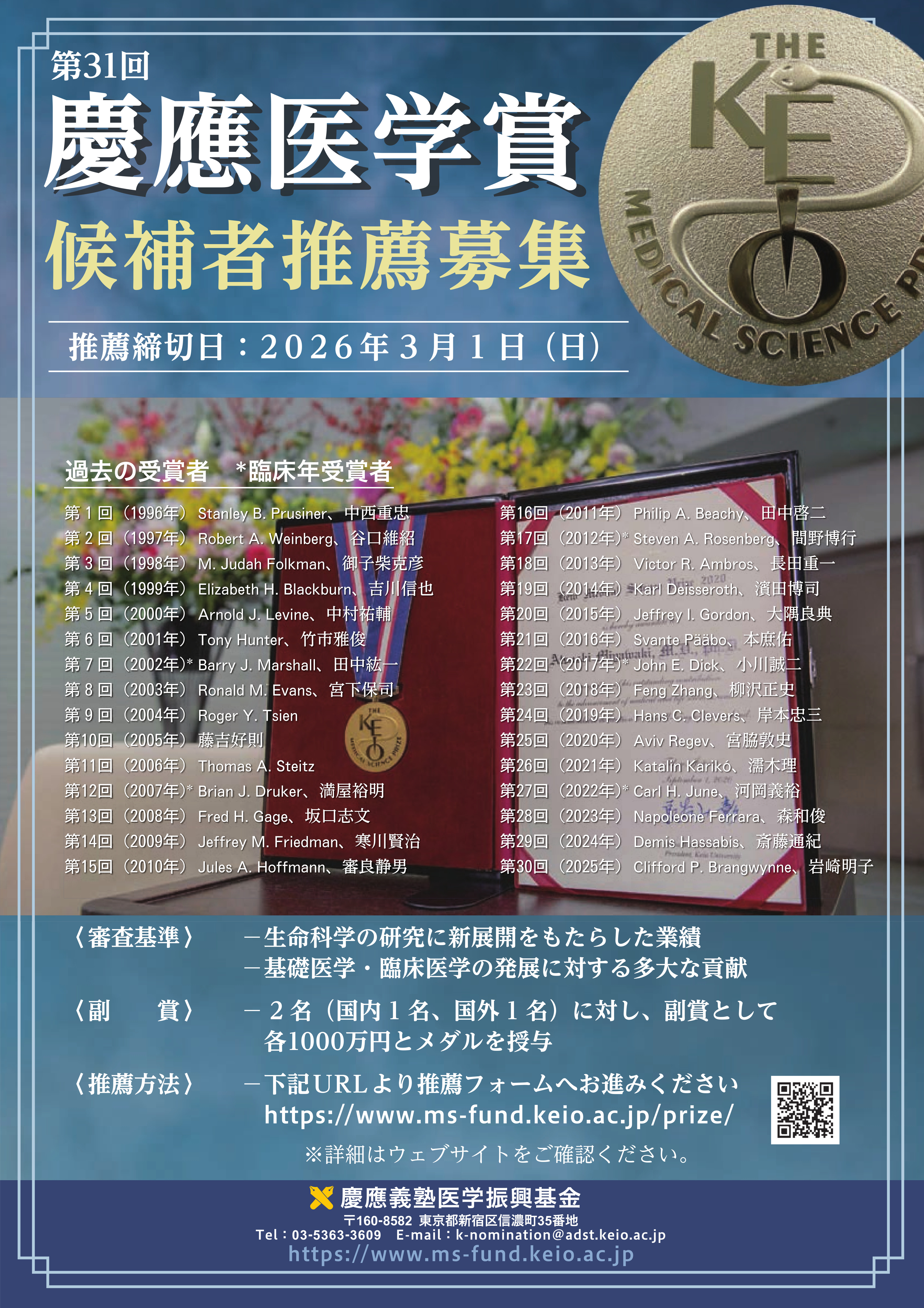 この度、慶應義塾では第31回(2026年)慶應医学賞候補者の推薦募集を開始いたしましたので、ご連絡申し上げます。