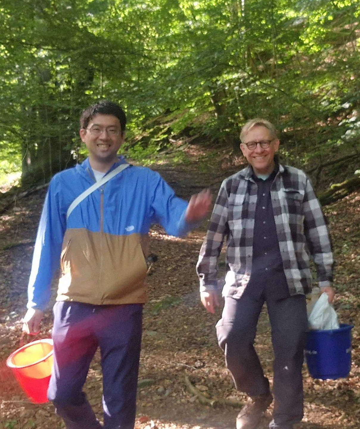 (写真) ハリガネムシ採集に勤しむ著者とAndreas