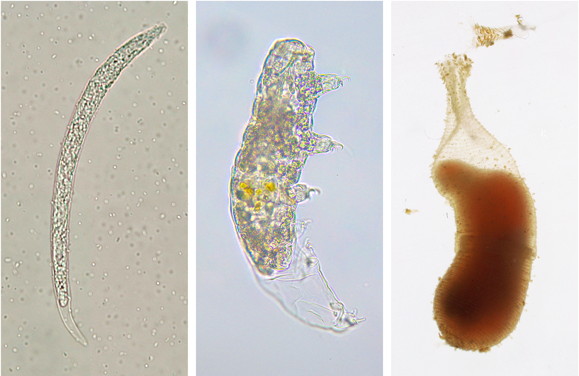 (写真) 私の飼育している脱皮動物たち(左から線虫Plectus sambesii,クマムシHypsibius exemplaris, エラヒキムシ Halicryotus spinulosus)。いずれも脱皮中の写真