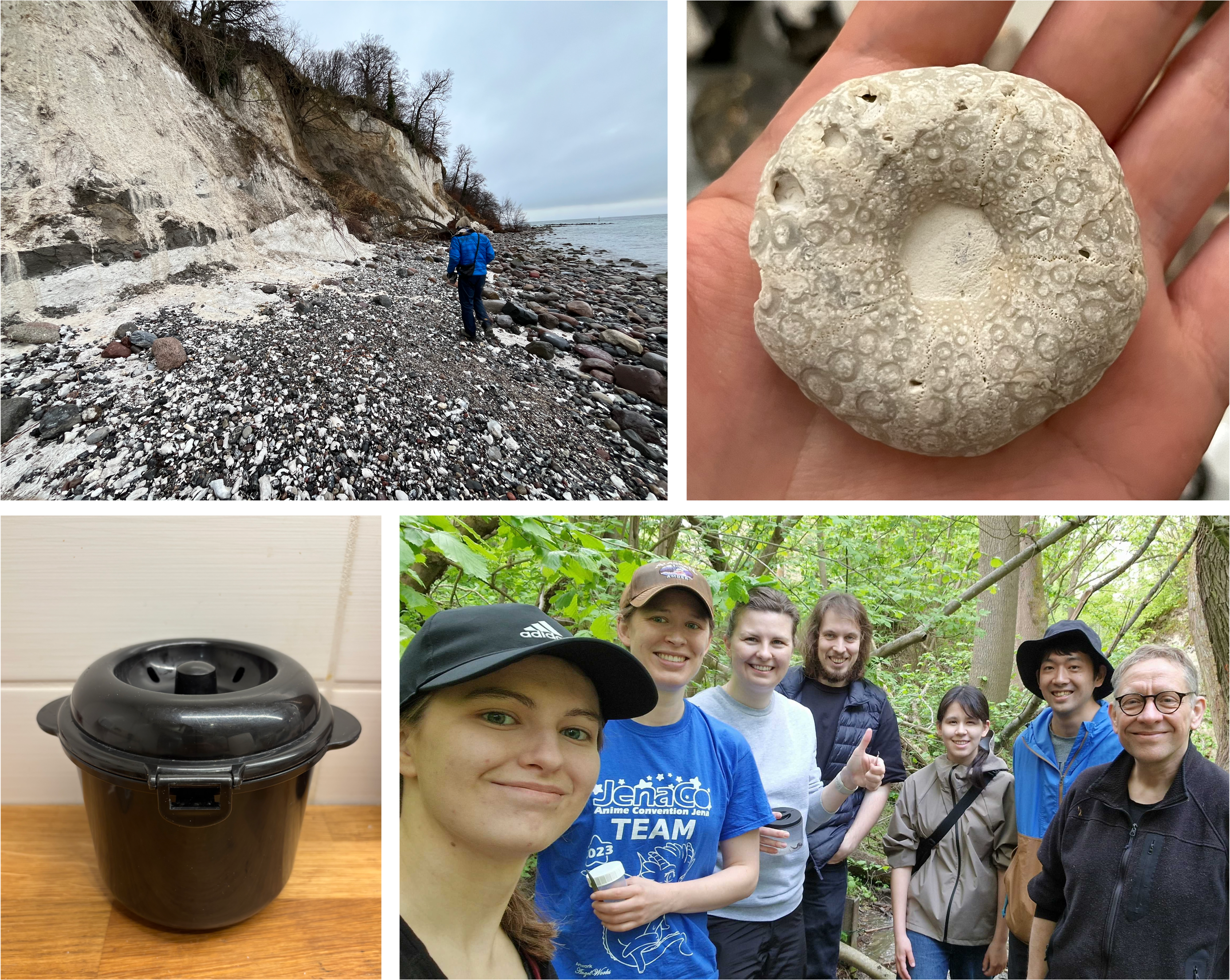 (上) Rügen islandの海岸で化石を探す著者と採集した正形ウニの化石。(左下) まだまだ健在な鈴木大地さんより頂いた電子レンジ用炊飯器(進化学会ニュース 2017 Vol. 18 No. 3参照)。(右下) ラボメンバー総出でのハリガネムシ採集。