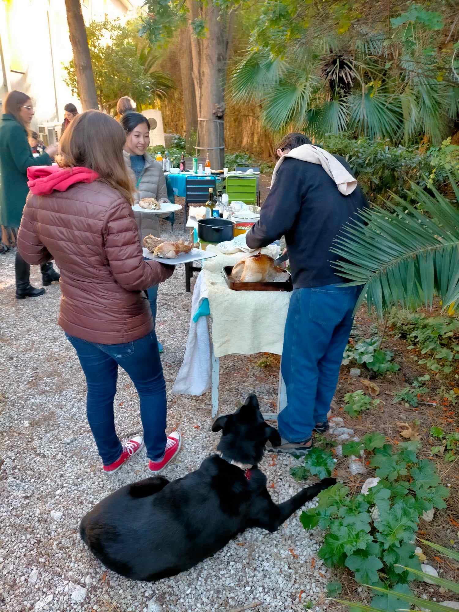 研究所の中庭で開催された感謝祭のパーティー。手前はターキーを切り分けているところ。