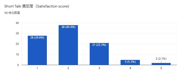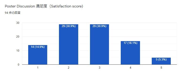 24.ポスターセッションには参加できなかったので、回答は無効です(ポスターがゆっくり見られるようになっていたのは満足ですので1が入れてあります)。おそらくローカルな問題なのですが、時々回線の不調のせいでトークが途切れることが多かったです。