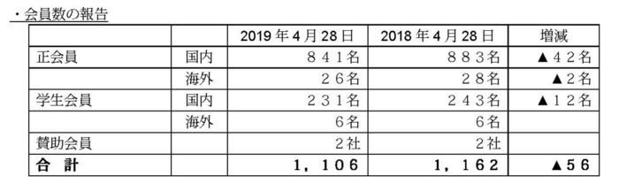 会員数、会費納入状況、岡田基金受賞者、2019年3月末会計監査、今後の派遣・招へい助成について報告があり、了承された。